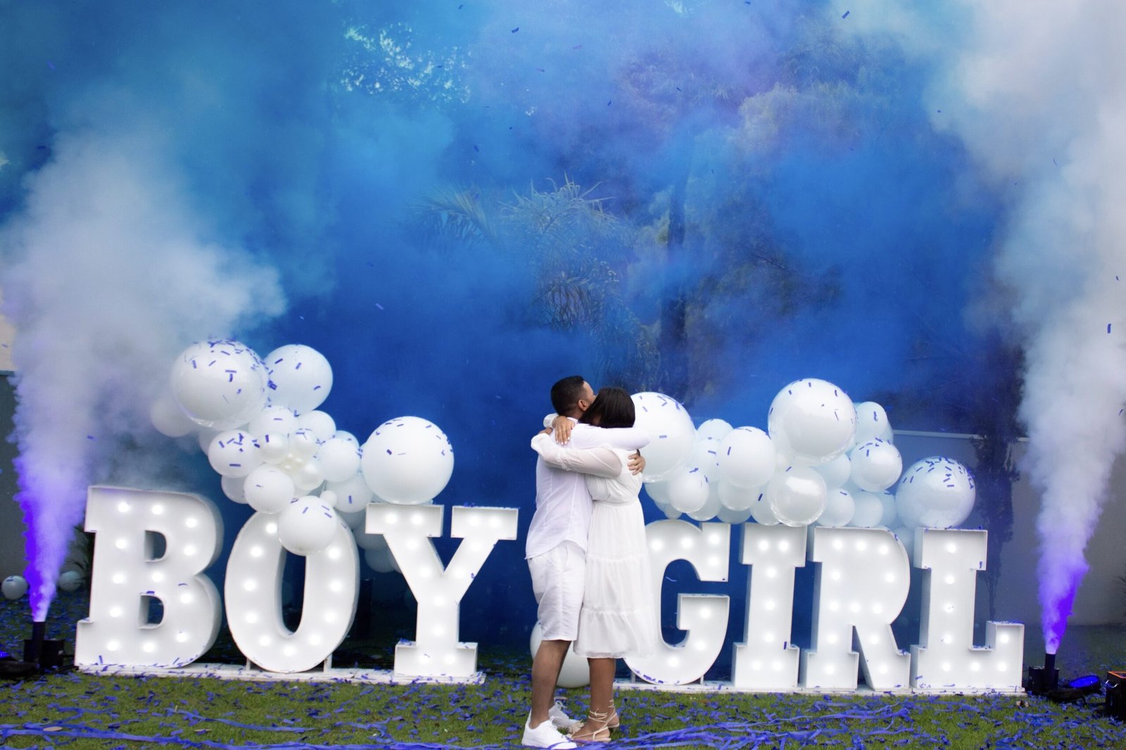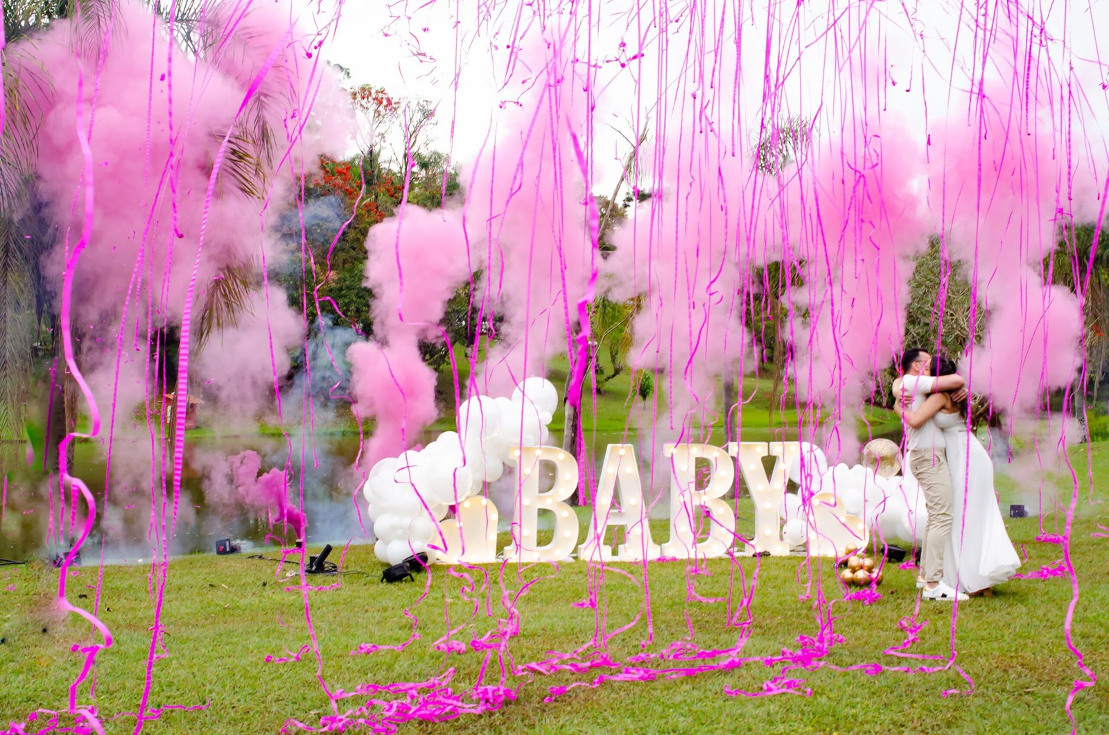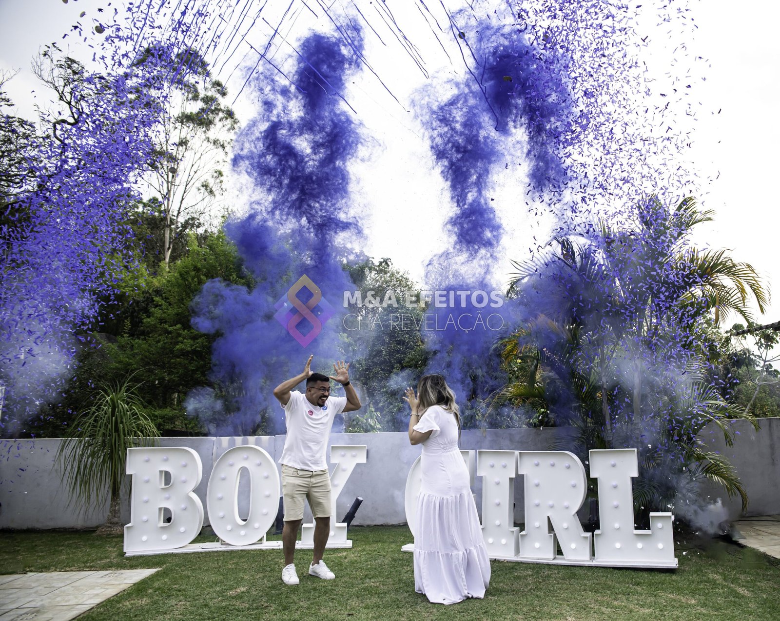 O pacote 1 é indicado para locais fechados, nele contém 1 máquina de papel e iluminação em parled em 2 cores que é startada na cor certa do sexo do bebê no momento revelação.